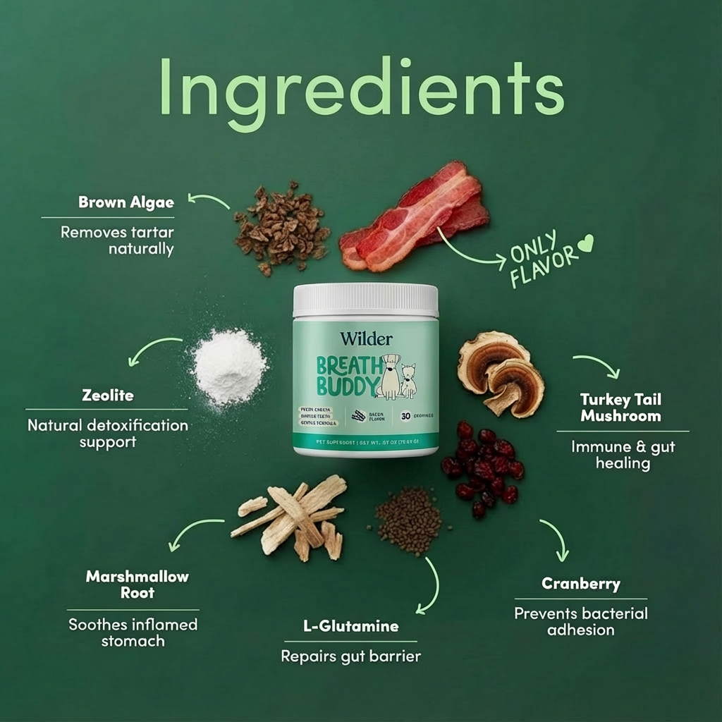 Bad breath isn’t just unpleasant. It’s often a sign of buildup and imbalance in the mouth. Wilder Daily Dental supports cleaner teeth and fresher breath using a gentle, food-based routine designed for daily use, even for pets with sensitive stomachs.